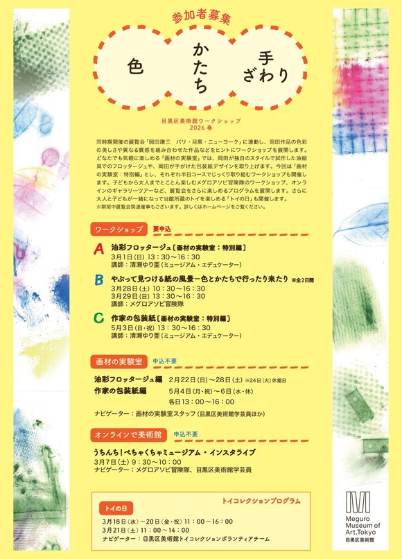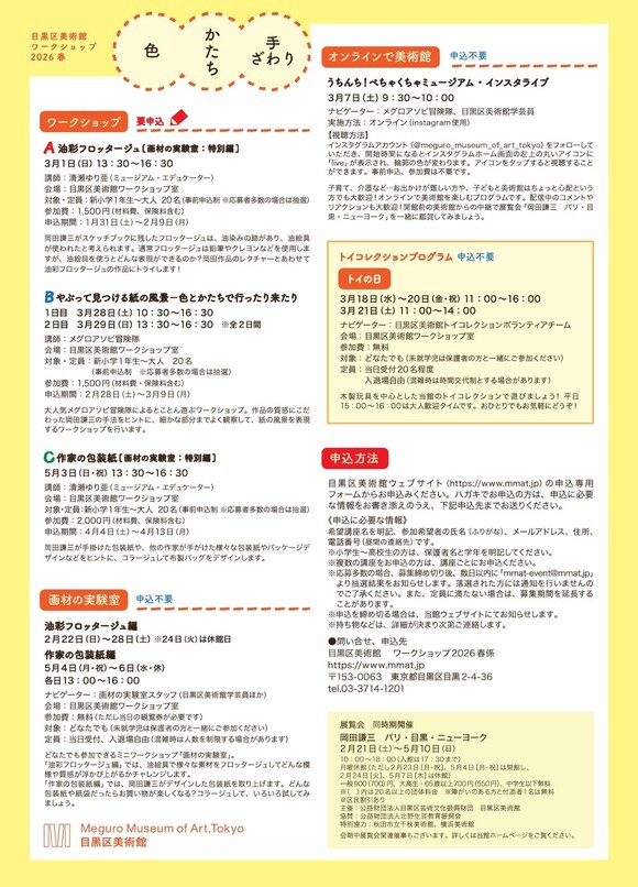 | 申込方法 | 下の専用申込フォームまたは郵便にてお申し込みください。 郵便の場合は、はがきに「参加希望ワークショップ名、参加者氏名(ふりがな)、住所、電話番号、電子メールアドレス、小学生~高校生は学年と保護者氏名」を記入して、〒153-0063 東京都目黒区目黒2-4-36 目黒区美術館 ワークショップ2026春係 へ申込期間内(必着)にお送りください。 *応募多数の場合、募集締め切り後に抽選を行い、数日以内にドメイン「@mmat.jp」より当選された方のみ、当日のご案内をお知らせします。持ち物などは、詳細が決まり次第ご連絡します。 *落選された方には落選通知を行いませんのでご了承ください。 *定員に満たない場合は、申込期間を延長することがあります。 申込を締め切る場合は、本ページでお知らせします。 |